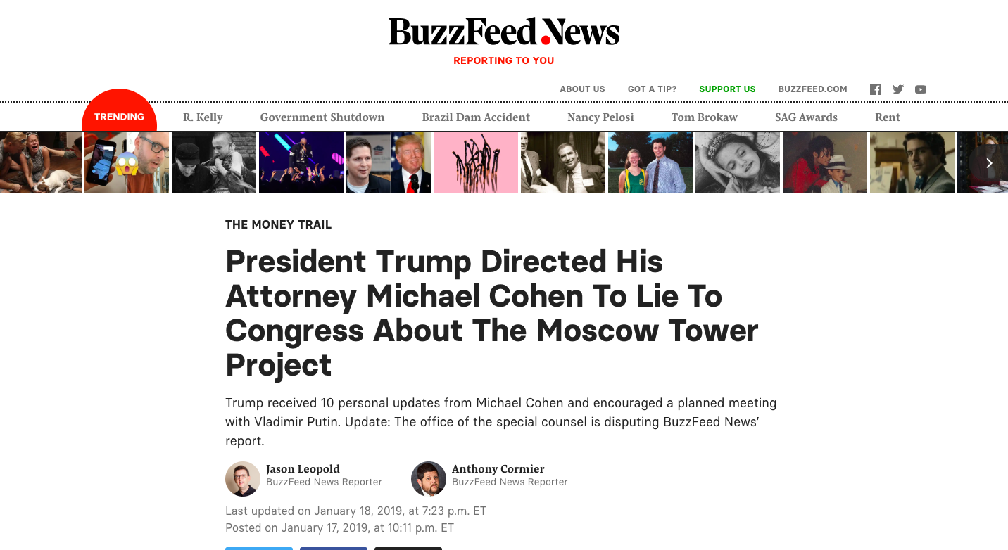 Can you trust an article that supports its central argument on anonymous sources? Well, Buzzfeed News’ article, “President Trump Directed His Attorney Michael Cohen To Lie To Congress About The Moscow Tower Project,” informs the audience that POTUS influenced Cohen to lie according to two unnamed “federal law enforcement officials.”